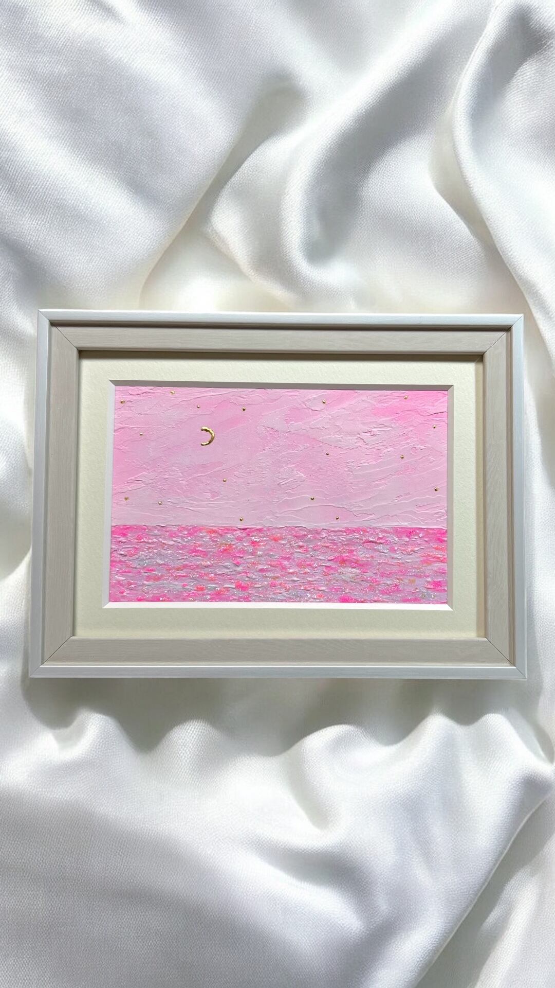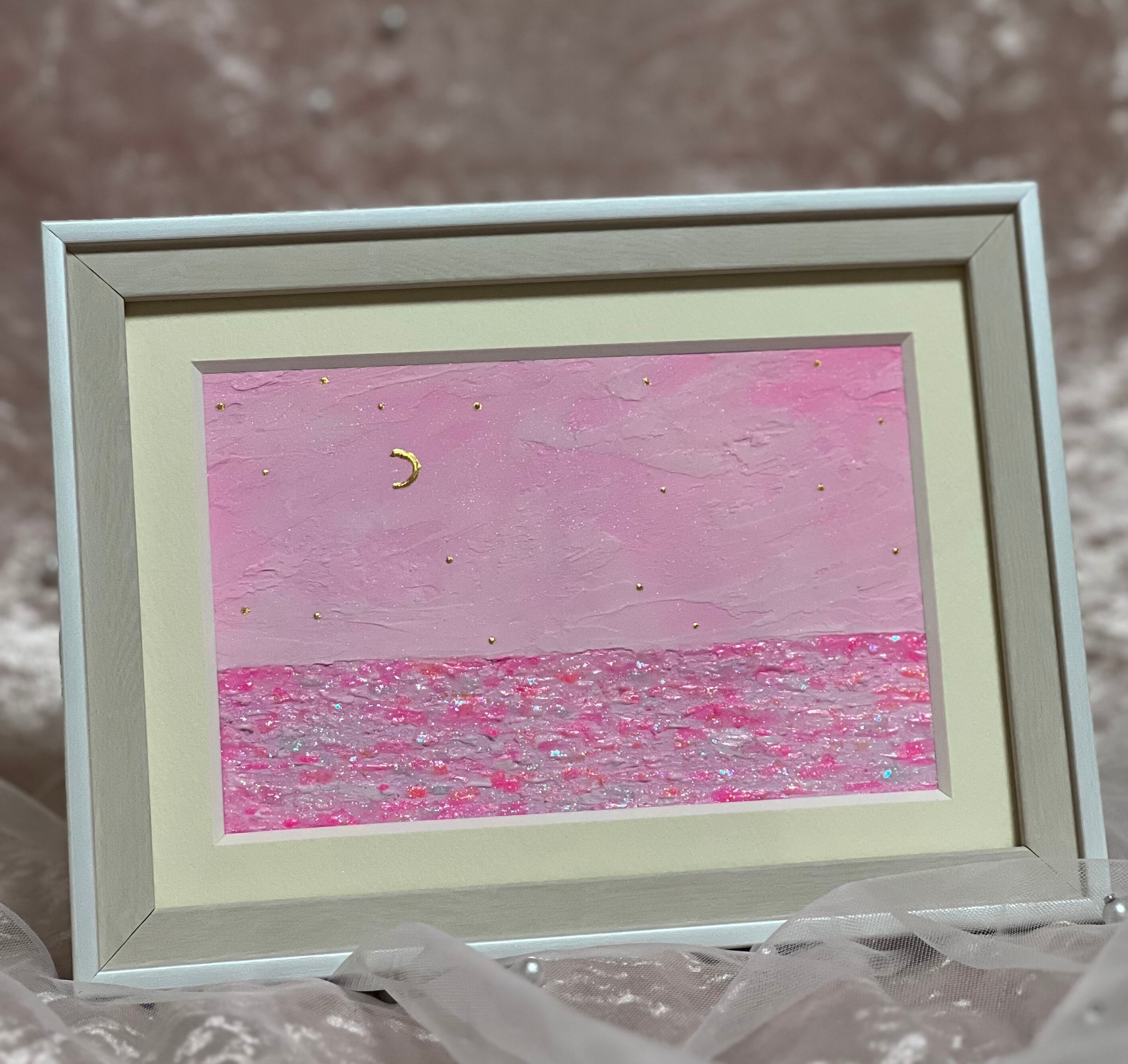 ペインティングナイフを使い、マットな質感で表情豊かな雲を表現しました。絵の具の重なりが、空に深みと「マットなのにキラキラ」という不思議な質感を宿しています。