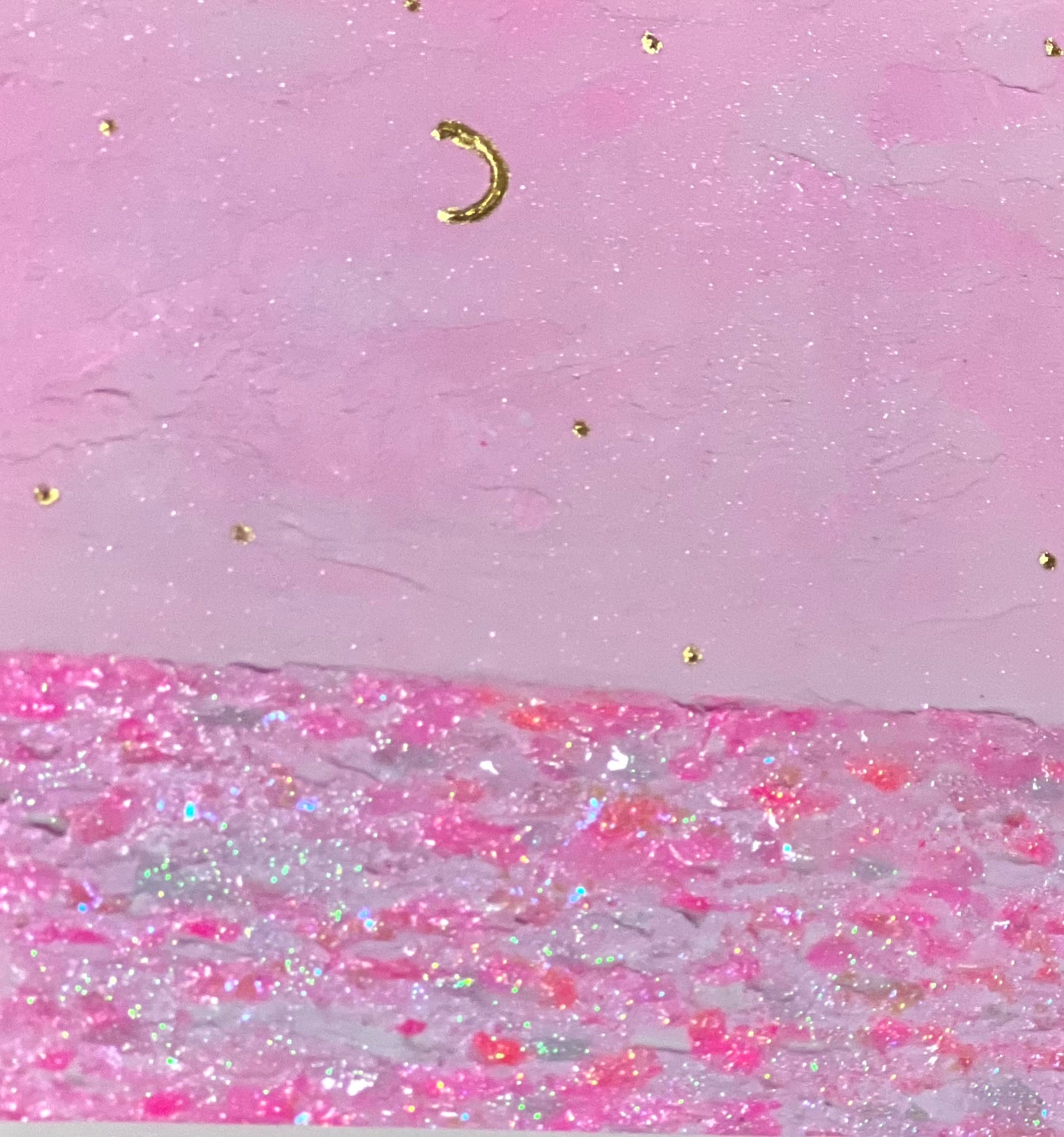 海を見守る月や星々には、本物の金箔をあしらっています。ナイフで描いた空の質感の中で、凛とした永遠の輝きを放ちます。